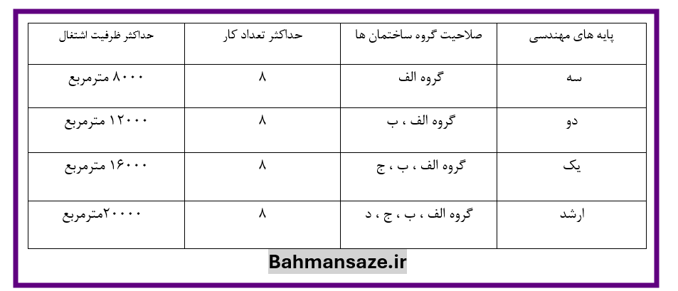 ظرفیت اشتغال دفتر مهندسی طراحی ساختمان که ملاک سنجش مقادیر آن عبارت است از مجموع سطح زیربنای کارهای طراحی در طول مدت یکسال منتهی به آخر اسفندماه هر سال برای هر یک از شرکای آن می باشد . باتوجه به تعداد و صلاحیت آنان به شرح جدول زیر است .